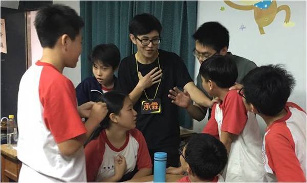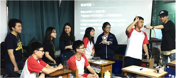 這張照片是「哲學批判與諮商」課程進行專業服務時,出隊到新莊國中做哲學推廣,和新莊國中的同學們解釋、討論哲學問題的情形。
